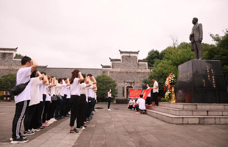 參觀完苗圃基地又乘車前往龍潭趙世炎故居,在主持人的帶領下,大家在車上齊聲高唱《沒有共產黨就沒有新中國》、《黨啊親愛的媽媽》《紅星歌》等振奮人心的愛國歌曲,激發起了全體黨員干部無限的愛黨愛國熱情。來到趙世炎同志紀念館,全體黨員向趙世炎同志敬獻花籃,站在先烈的雕像面前黨員們面對著黨旗鏗鏘有力的重溫入黨誓詞:“我自愿加入中國共產黨,擁護黨的綱領,遵守黨的章程,履行……。”隨后,大家懷著十分崇敬的心情參觀趙世炎同志故居,認真聆聽講解員詳細介紹趙世炎烈士革命的一生。